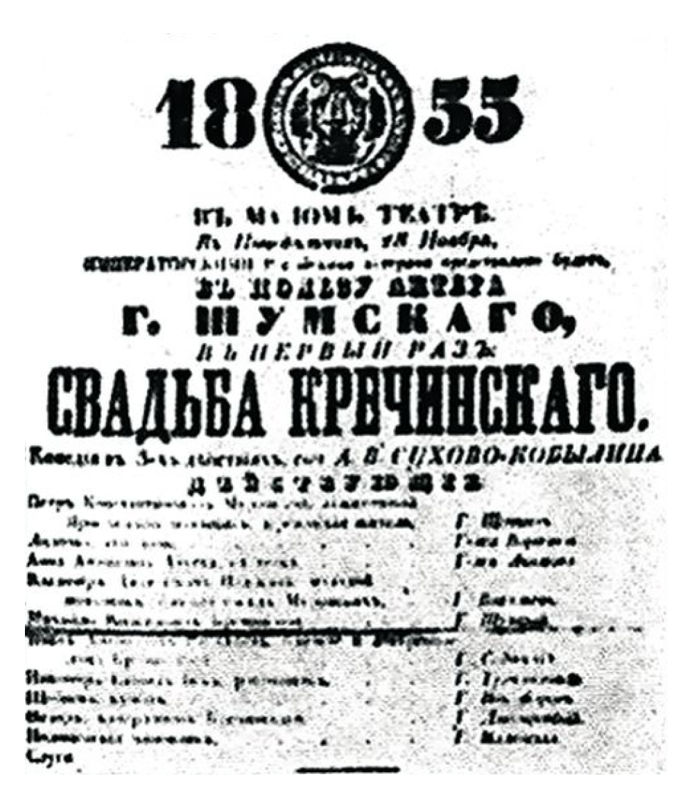 Афиша премьерного спектакля «Свадьба Керчинского» в Малом театре, 1855 год